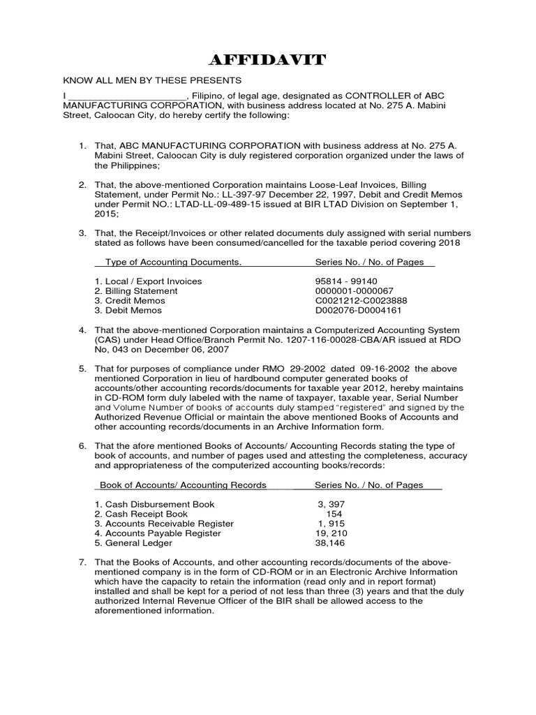 Write a letter of intent addressed to the BIR stating your intentions of using a loose-leaf book of account and the reason why. In this article youll find everything about Sworn Statement or Sinumpaang Salaysay including sample templates you can download for free. In lieu of the investigation pursuant to RMC No.